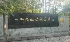 一二九运动纪念亭位于保卫华北石刻对面,隔沟相望的石砌方院中,八个鎏金大字,是由全国人