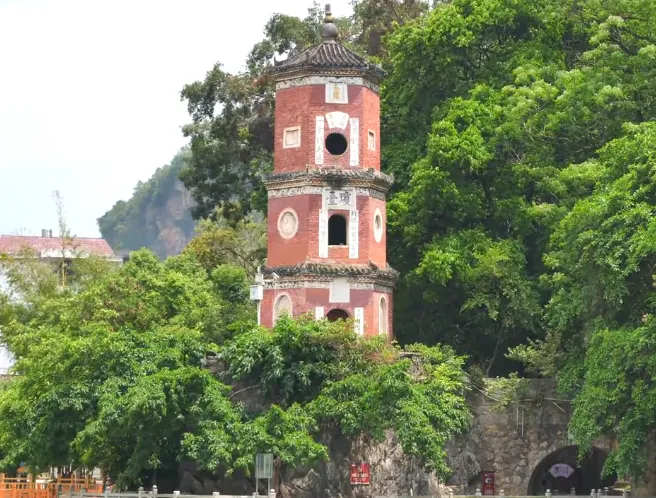 丹桂塔位于感驮岩右侧,清光绪年间建造,塔身在一潭碧水中凸起的大盘石上,呈六边形,三层飞檐,葫芦塑顶,塔门朝南,塔内有木梯,通到顶层,神台置于其中。大盘石与岩上筑有石桥相连,名为“青云桥”。有个神奇的传说流传久远,清代光绪中叶的某一天,烈日当空,潭水突然泛滥,淹没附近稻田。水退后,沙滩上出现一条巨蟒,长十数丈,盘成一座小山丘。百姓认为这是一条孽龙,会给当地