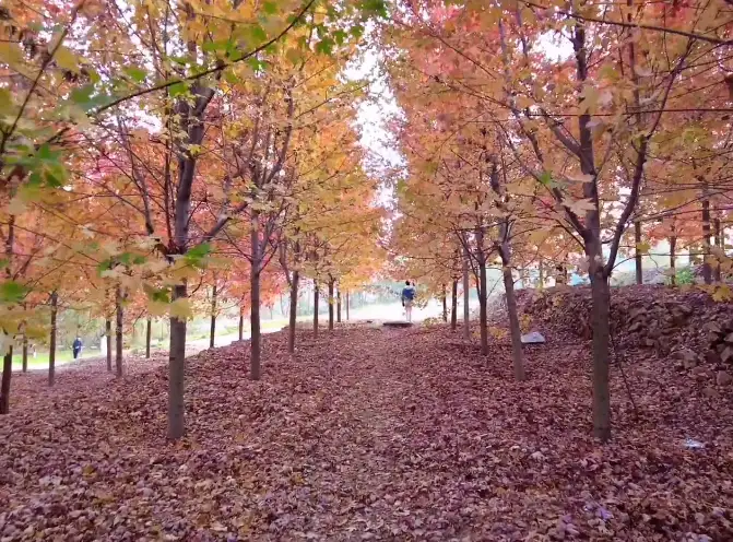 走在林间小路,头上是茂密的树枝纵横交错,阳光从缝隙中倾泻而下,照在被踩得飒飒作响的落叶上,声音回荡林间,恍若置身桃源,十分惬意。