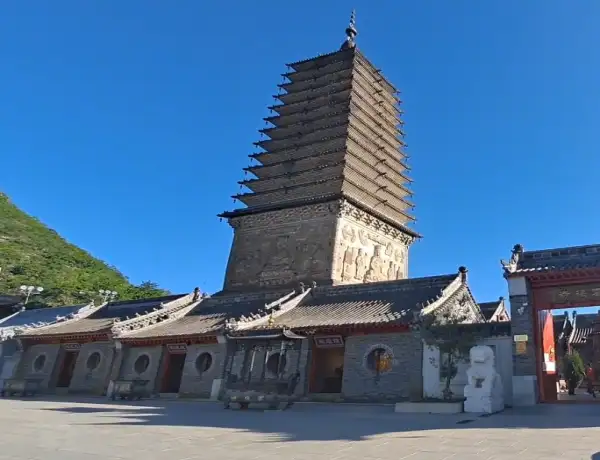 摩云塔耸立于云接寺内,构成塔寺结合,交相辉映的独特景观,塔建于辽代,为方形实心十三级密檐式砖塔,高37米。四面塔座,中央均设假门,两侧砖砌浮雕化生童子、伎乐人、莲花、净瓶等图像,四角柱上雕金刚力士像,其上为双层仰莲座,中间一周刻有密宗法器金刚杵、法轮。塔身四面各于中央浮雕坐佛一尊,盘腿端坐于莲花宝座之上,座下为马、孔雀、金翅鸟和象四种生灵。此塔
