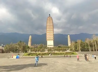 崇圣寺三塔属全国重点文物保护单位,位于原崇圣寺正前方,三座塔鼎足而立,千寻塔居中,二小