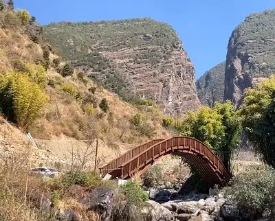 红岩双瀑,两条瀑布从山顶倾泻而下,融合一起,犹如夫妻共结连理,又称夫妻瀑,当地公路部门因