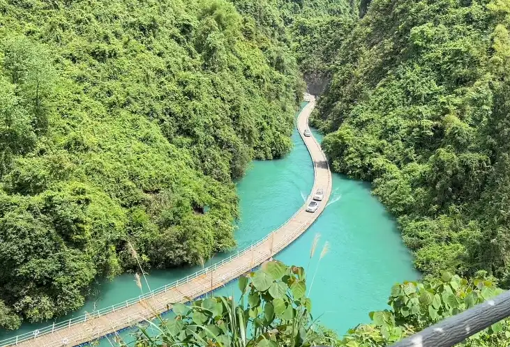 狮子关水上浮桥长度为400米,宽4.5米,可同时容纳10000人在上面行走。行走在浮桥上,观两岸,