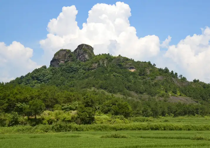 云盖山位于万坊镇南坑村与麻源水库(田背村)之间,古人登临此山多从麻源这边上去,那个时候,没有水库,几条河流冲积的平地,聚焦了不少村庄,而这山下的道路,是从宜黄过南城去临川的重要通道。站在县城西望,往赤面山的后面看见一座比周边高的山,就是云盖山,大小两个山头,如毛笔的笔架,又如蛟龙昂首。去到麻源这边细看,会发现在丹霞红砂岩集中分布的这个区域,云盖山很独