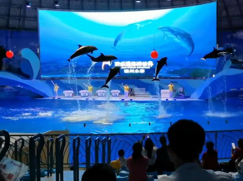 这里融观赏性、娱乐性、科普性于一体,展示面积15万平方米,由极地探秘、圆梦海底、海豚奇趣剧场等十余个主题场馆组成,海洋极地动物种类丰富繁多,拥有七头白鲸、八头海豚、北极熊、海象、海狮、海豹、海牛、江豚等珍稀极地海洋动物,独创海豚梦幻水幕秀,白鲸奇遇浪漫光影秀,人鱼奇缘等精彩演出,融入了自然、生态、绿色环保、研学旅游等概念,处处体现出人与自然的和谐。
