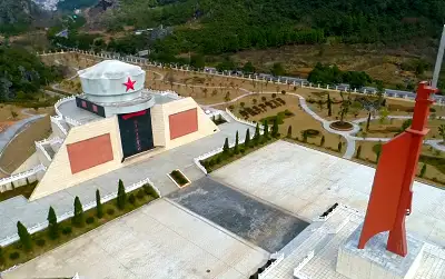 新圩阻击战陈列馆位于灌阳新圩阻击战主战场前沿阵地枫树脚,该馆主建筑造型为五角星建筑,由四个底部宽度12米的五星向中间靠拢组成,内部结构分三层加基座共四层,高23米,顶层为观光台,基座一层为展厅。展厅将新圩阻击战革命历史及文物“红军三次过灌阳”“新圩阻击战”“悲壮34师”“鱼水情深”“精神永存”等五大板块展示。陈列馆左边是高3.5米,宽4.5米花