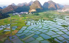 会仙玻璃田,位于临桂区会仙镇沐宦头村。这里四面环山,阡陌纵横,稻田如明镜,倒映着天光、山