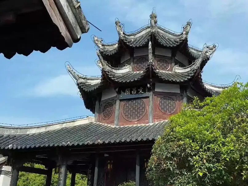 文昌阁还以其独特的平面形式和奇妙的结构在全国古建筑界极负盛名:阁高20米,通圆阔11?47米,进深11?58米,为三层三檐九角翘檐,九面开窗,除底部为四方形外,二、三层皆为九边形,屋顶为九角,梁为十八根、柱为五十四根,二、三层的楞木各为九根。底层为四方,二、三层为九方。