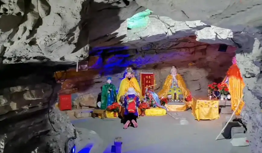 药王洞位于五岩山山顶。为一天然钟乳石洞穴,是孙思邈栖身之处。全长近500米。入得洞内,蜿蜒曲折,幽暗深邃,洞中有洞、洞中有楼、洞中有峡谷。有药王起居室、诊病室和升仙堂。天造地设炼丹炉、诊病石、灵芝石、问诊石等众多奇景,巧妙契合药王接诊、炼丹活动之人、物场景,自然景观与药学积淀、道家生活完美融合、相得益彰。洞内各色灯光交相辉映,光怪陆离、神秘诡异,被广大游客誉为“豫北第一洞”。