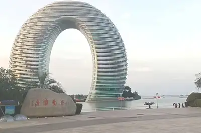 地起太湖水陆之间的月亮酒店,形似弯月、状如指环,是国内首家水上白金五星级酒店,可与迪
