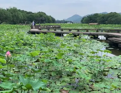 荷花庄以其夏季景观为特色,亭台桥阁古朴典雅,碧叶婆娑莲荷曼舞,格调清新、质朴,具有浓郁的江南水乡风情,是一个有关西施历史人文与乡野荷花自然美景相结合的别具一格的景点