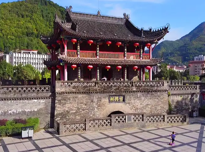 东门楼,又名古兴州东门楼,始建于明正德年间(1511年),位于八渡河西岸、县城中心广场东则,故名