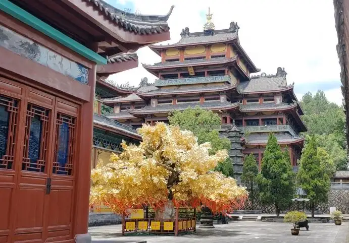 大智禅寺不会太大,人也不多。有一片竹林很苍劲,很好看,有一棵很大的许愿树,金灿灿的,上面挂满了许愿牌,阳光下特别好看。寺庙里有个放生池,里面应该是很多乌龟,大的小的都有,懒懒的晒太阳。大殿也比较有气势,出口得地方是有很多的商业铺,东西大多都是在哪里都可以买得到的,没有什么特色,有很多佛教用品之类的。