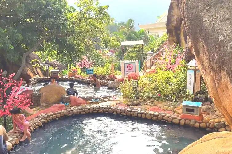 度假邨内建有占地10万平方米,由唐式、欧式、日式三大温泉区和服务配套设施组成的温泉谷;建有面积13万平方米,水流日夜不息的山泉泳场;还建有8.8万平方米的高级别墅、7800平方米的国际会议中心,内设有大大小小的会议室和康体中心占地6000平方米,其中2个网球场、2个篮球场和2个羽毛球场均按国家标准建设,为游客提供锻炼身体的好地方。