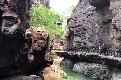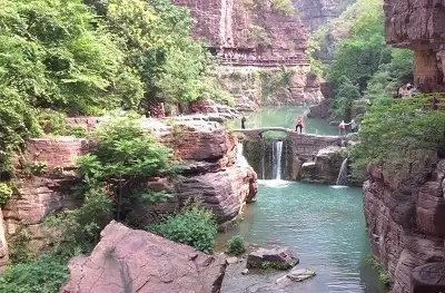 红石峡,古称温盘峪,是云台山最知名的景点,峡中的红石碧水漫曲桥的画面让人过目难忘、心