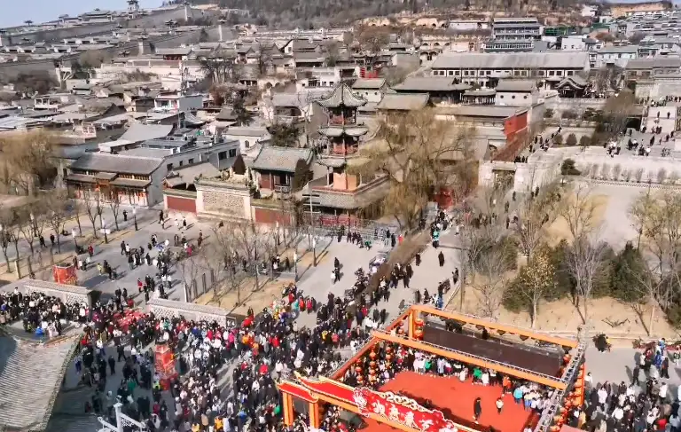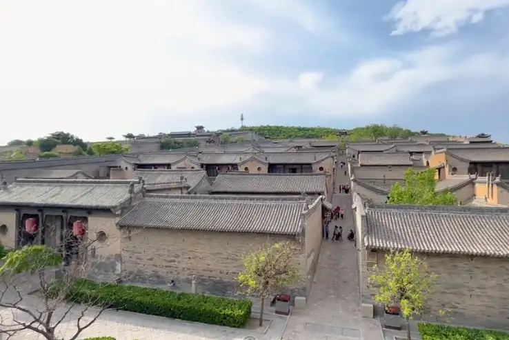 王家大院恒贞堡(红门堡)建筑群建于乾隆四年(1739年),乾隆五十八年(1793年)竣工,前后经历了54年。整座建筑依山而建,从低到高,共分四甲,甲与甲之间的横向通道与中间的纵向干道形成了一个很规整的「王」字。恒贞堡布局隐含了一个「王」字,眼前主干道就是那「王」字的一竖,由南向北由下而上一字贯穿,这条主街将整个建筑群左右分开,这条用大块河卵石铺成的街人称「