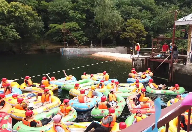 红崖峡谷漂流位于景区内爱情谷到夹板沟之间的青山乐水带,全长2.5公里,海拔落差高达百十