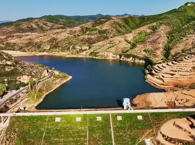 明通沟水库位于黄河一级支流蔚汾河中游,地处吕梁市兴县县城东北20km的恶虎滩明通沟村,水库波光浩淼,湖水清亮如镜,清澈蔚蓝。阳光照耀着碧绿的水面,清风微微,水面顿时波光粼粼;湛蓝的天空中,洁白的云朵卷舒自如;而岸边,深邃的水面倒映着如黛的绿树,树木随风摇曳着、舞动着;远处山坡上,一丛丛的树木茂盛着青翠着;在这里静心而坐,悠闲自在,看着湖光山色相互掩映,悦目