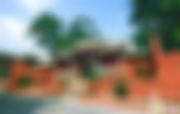 蓝天映衬着白云,溪流漂过,鸟语花香,梅花鹿顾盼左右,整幅图案隐喻着“有禄”、“加官”的美好祝愿。这四幅明代门画,线条圆润浑厚,具有很高的工艺水平。 关圣殿高15米,正中为通体鎏金的关羽坐像。像高5米,宽3米,头戴冕鎏,金脸长须,身穿绣龙袍,衣纹流畅自然,腰束玉带,手执牙笏,神情威严,一副帝王模样。
