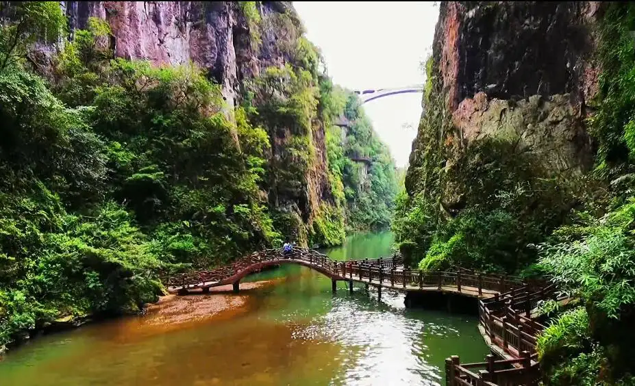 掌布河峡谷幽深,河水清澈见底,两岸悬崖高耸,陡壁险峻, 原生植被郁郁葱葱,自风光十分秀美