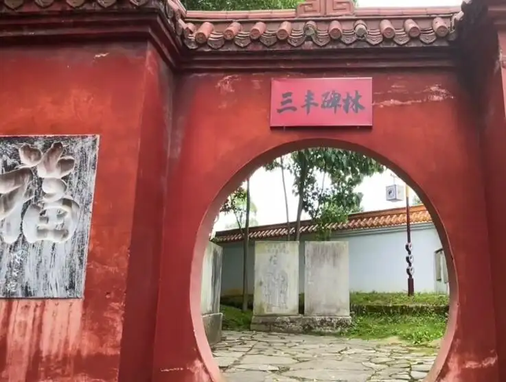 在福泉山右侧,便是一九九七年修建的张三丰碑林。在碑林的圆门两侧有台湾著名书法家陈大络题的“福”、“武”两字,“福”指福泉山,“武”指武当山,即是张三丰在武当山得道,在福泉山成仙。福泉山和武当山有近600年的友好关系,武当山的紫霄宫还是福泉人张信去组织修造的。
