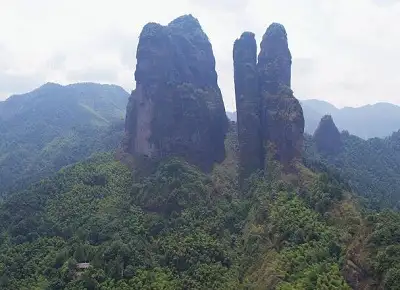 江郎山位于浙江省衢州市江山市江郎乡境内。江郎山景区由三爿石、十八曲、