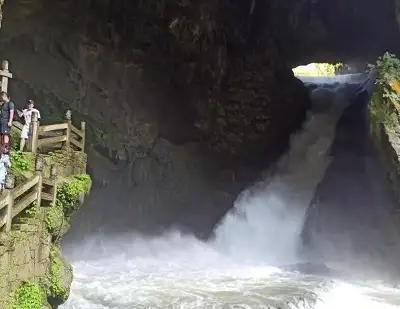 龙门飞瀑是中国最大的岩溶洞穴瀑布,瀑布高34米,宽25米,是龙宫风景名胜区的著名景点之一。在高大的半圆形溶洞内,一股湍流从洞顶的缺口流下,白色的瀑流像一条银龙腾出,水流撞击洞低,溅起万朵水花、团团水雾,阳光照射下,一道美丽的彩虹出现在洞口,宛如仙境。 这里的山被水几万年的冲刷,形成了一个巨大的口,从里面喷涌而出的水,就象是巨龙张开大口在向外喷...