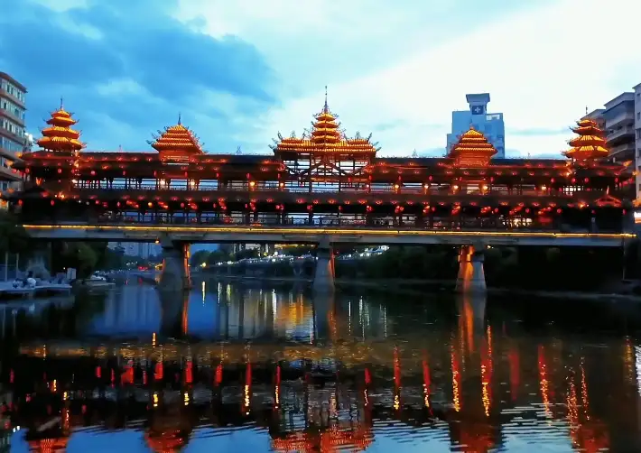 文澜桥又名“宣恩风雨桥”。该桥为步行桥,长80米,宽10米,高约26米。桥下部为钢混结构,五礅四跨;上部为全木质结构,采用侗族花桥和鼓楼及土家族凉亭桥相结合的建筑风格,22架木排采用中国南方特有的穿斗式组合结构,榫铆衔接的梁柱体系,亭檐上下均为飞角斗拱,屋脊瓦沿设有古朴装饰,二楼过道设有靠背座板,桥头南北两面有砖石结构的门楼,门楼南北门外分别立有座式麒...