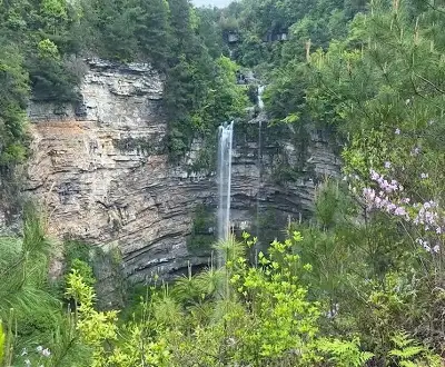 摆弓岩瀑布位于高坡乡水塘村,距乡政府所在地4公里,摆弓岩瀑布峡谷深陷,自东向西流水跌宕而下,形成70米、36米、86米的三级瀑布,奇险惊人。第一级瀑布,高70米、宽30米,水落处形成——天潭潭深10米,直径40米,峡谷曲曲缓缓冲下,谷底清水缓缓流动,鱼儿嬉戏,卵石光洁,顽童巡溪,动物化石随处可见,如今有待专家对化石的考证。第二级瀑布,高36米,气势缓和,形状...
