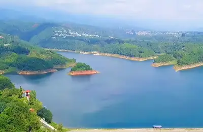 白庙水库位于贵溪彭湾乡应天山东麓,是1958年修建的中型水库,丰水期面积达2千亩、库容达3千万方。水质良好,周边均为密林,犹如碧玉镶嵌丛山之间,与应天山山水相映;岸势犬牙交错,库中岛屿3个、半岛7个。环水库公路约10公里。水库波光浩淼,湖水清亮如镜,清澈蔚蓝。阳光照耀着碧绿的水面,清风微微,水面顿时波光粼粼;湛蓝的天空中,洁白的云朵卷舒自如;而岸边,深邃的水...
