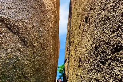 嵖岈山一线天高10多米,长20多米,宽约30厘米左右,人们从里面抬头看天只能看到一条线,故名"一线天"。请大家注意行走的方式,要侧身面壁而行,肩背旅行包的请取下来用手提着,腰围尺寸比较大的朋友请把腰带紧一紧,穿厚衣服的请把外罩脱下来,尤其是要注意手机、照相机和摄影机的安全,最好是胖瘦间行,关键时刻好助一臂之力,要小心慢行,亦步亦趋。 地址:驻马...