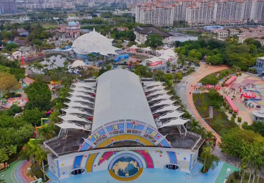 这里有国际领先的高空飞翔体验项目飞越极限,大型动感太空飞行体验项目星际航班,神奇的互动卡通脱口秀节目嘟比农庄,充满了魔幻色彩的西部传奇,色彩斑斓、如梦如幻的海螺湾……鸟瞰整个公园,色彩缤纷、风情万种,巨大的银河广场和海螺湾剧馆抢先和大家sayhello,建筑的风格可以用奇幻、梦幻、魔幻来形容。
