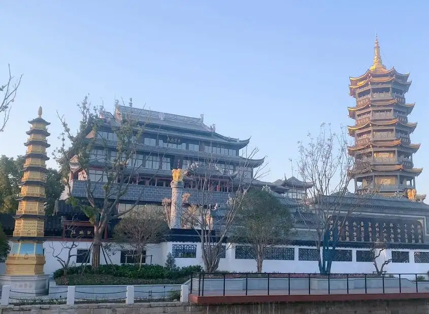 寺前设三楹弧形石牌楼一座,中间匾额书“慈航普渡”四字,南北向各有对联两副,南向为“天朗气清,慧日普照,国运隆盛;莲香叶落,和风送暖,民生乐利”(严道人书)“湖波澄静琉璃界,古镇兴隆极乐苑”(徐圆圆书),北向为“佛号观音,南无时闻耳畔;寺名九华,地藏即在眼前”(徐容深书)“塔影回悬霄汉上,佛光常现水云间”(凌在纯书)。