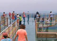 山叶口玻璃栈道长850米、其中200米长全透明高空环崖峰360度观景的高空玻璃栈道!绝壁临