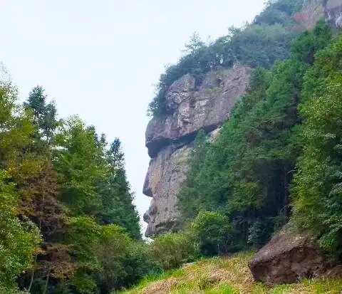 将军岩因其酷似人侧脸肖像,形象刚毅而名。为近水平流纹构造的流纹岩,受节理锚列,加之崩塌作用和差异风化,形成眼、鼻、嘴等的头像轮廓,附生的植被则构成了人的头发以及胡须等,惟妙惟肖。