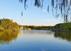 整个湖岸呈弧形,是一处玩沙、嬉水等各种休闲活动的消暑去处。清晨是金沙湾最美的时刻,每当晨曦微露之际.,整个湖面都泛起了条条的金