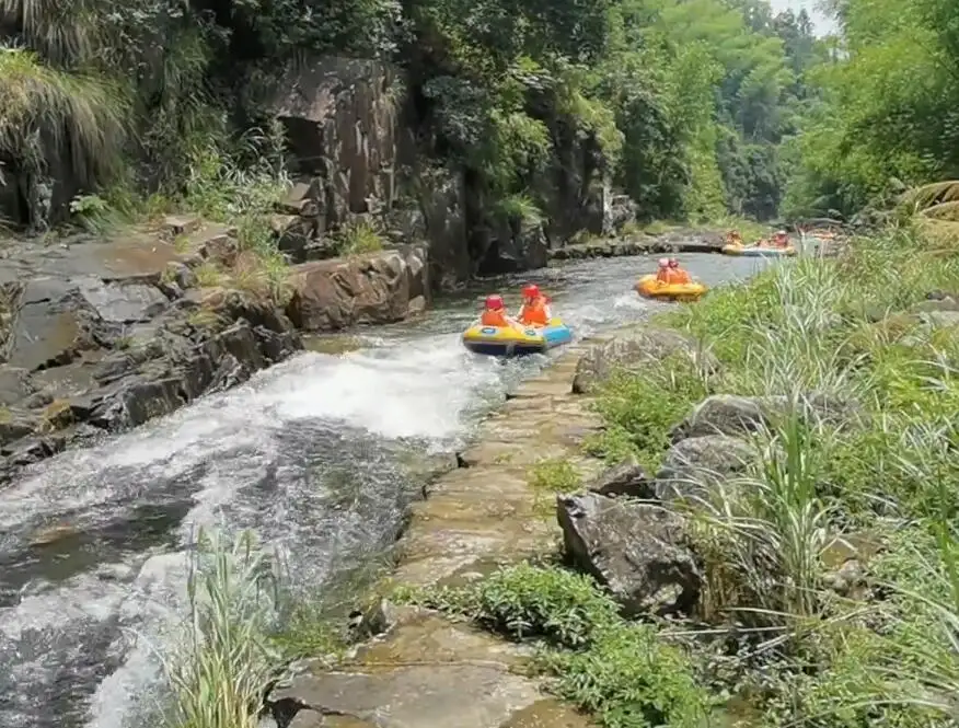 漂流开始时,要开库放水,水库开闸,原本舒缓的溪水陡徒然变得湍急,不过不需要担心,虽然水流湍急,但航道的布局和结构很理想,既有高度紧张的刺激,又有放松自如的舒坦。最重要的是,有工作人员在航道边护航,遇到船被卡住等一些困难时,提供全程帮助。
