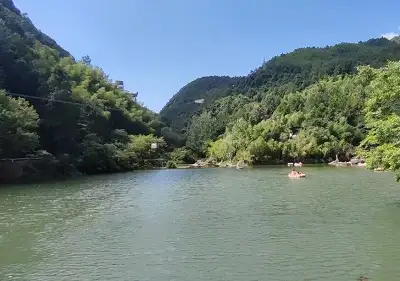 灵山大峡谷漂流全长2公里,河道落差达68米,漂流时长约60分钟,两岸山色秀丽,深潭、怪石