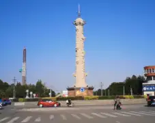 肃宁九龙柱位于肃宁县城东城入城转盘处,柱高26.6米,由基座、柱座、柱身、地球仪、科技光