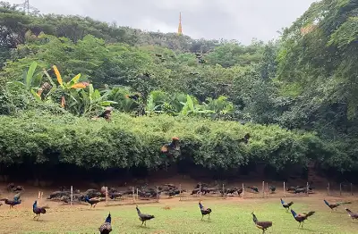 孔雀园内有大小孔雀200多只,羽色华丽、尾屏修长、仪态优雅,开屏率在60%以上,甚是惹