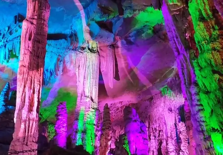 蝙蝠洞曲径通幽,洞内再开天窗,天窗口灌木倒生,藤蔓垂吊,苔迹斑斑。深入洞内约 100 米处,一道泉水从逼仄的错落的石壁上斜拉着冲泻下来,汇成一汪浅浅的潭水,洞外的太阳光见缝插针,斜拉着照射进来,在波光粼粼的小石潭上形成一根雾状的光柱,奇异的光雾翻腾着,悸动着,美得驰魂夺魄。地址:宜昌市五峰土家族自治县栗子坪村门票:详情咨询景区开放时间:全天交通参考路线: