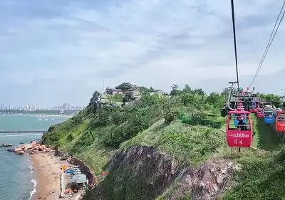 跨海索道通向田横山,索道20元,可以往返,可两人同坐。从索道上望去,大海壮阔,山峰峭陡,