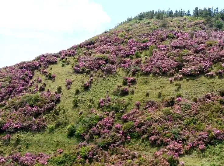 她们,亦白亦红,一簇簇,一片片,一朵朵。有的热烈奔放,有的娇艳欲滴,在磨盘山四月的春风摇曳中,更显娇艳妩媚。漫山遍野,姹紫嫣红,绚丽多姿,仪态万千,其中,大王杜鹃为省级保护神,分布于海拔2200以上,树木枝干粗壮,不仅具有保护价值,而且还具有极高的观赏价值。杜鹃花的箴言是当见到漫山杜鹃盛开,就是爱神降临的时候,平日里忙碌的你们,放下烦恼和压力吧。