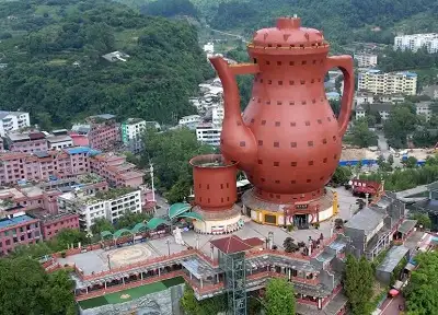 天下第一壶茶文化博览园远远的就看到了市中心湄江边泮山顶上的茶壶和茶杯,体型很大,号称第一壶,已成为湄潭县城的地标,旁边还有县城最好的酒店——天壶国际大酒店。火焰山一边挺陡峭,山腰上有些老的亭阁,绿化也不错,值得去看看!