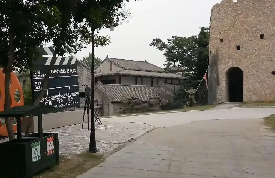 现影视城占地50 余亩,建筑面积11800 平方米,是一座具有民国时期建筑风格的城池。站在铁道游击队影视城城门口,你会发现这座城是由一座大围墙围起来的。围墙是由青砖灰瓦所垒,突显一种清末民初时期的时代氛围。城门正上方写着“临城”两个大字,走进城门,又仿佛走进抗战时期的老枣庄。